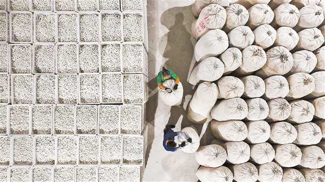 10月13日,黔江區(qū)高新區(qū)一絲綢公司,工人將烘烤好的晚秋蠶繭打包入庫(無人機(jī)照片)。 近年來,黔江區(qū)把蠶桑作為經(jīng)濟(jì)增收、農(nóng)民致富、鄉(xiāng)村振興的生態(tài)產(chǎn)業(yè)來發(fā)展,根據(jù)季節(jié)和桑園所在地的不同海拔,全年分7批次飼養(yǎng)桑蠶?!?/p>