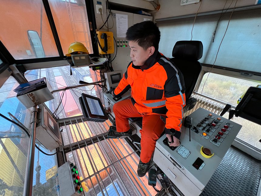 點名交接、檢查潤滑、點動試吊……1月29日9時,鄭雨雙像往常一樣,熟練而精準(zhǔn)地重復(fù)著標(biāo)準(zhǔn)的工作流程,做好一系列準(zhǔn)備后,他開始了一天的“抓娃娃”工作。不過,他抓的不是玩具布偶,而是一個個重達30噸的集裝箱。他的“游戲室”是離地16米,只有2平方米的龍門吊司機室,他需要爬上6個旋轉(zhuǎn)式的階梯才能到達那里。