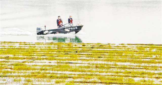 四月一日,在江津區(qū)鼎鍋浩魚類產(chǎn)卵場建的人工魚巢,護(hù)漁志愿隊(duì)正在進(jìn)行巡護(hù)。記者 張錦輝 攝