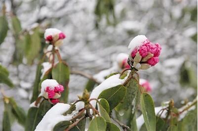 4月21日,受降溫影響,紅池壩國家森林公園迎來一場春雪,呈現(xiàn)了難得一見的雪映杜鵑美景。