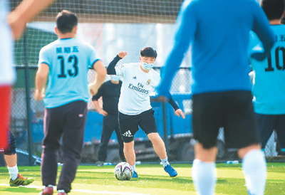 足球愛(ài)好者在武漢百駿體育公園足球場(chǎng)上踢球。新華社記者 肖藝九攝