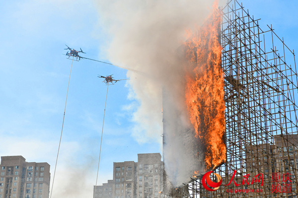 此次演練中,多機(jī)種多功能無人機(jī)系統(tǒng)承擔(dān)了火情偵查、破窗投送防毒面具和防火服、破窗投送消防水帶、撲滅明火等多重任務(wù),為科學(xué)制定救援方案、安全解救被困人員、迅速有效滅火提供了有力的硬件支撐。整個演練中,應(yīng)急救援隊伍展現(xiàn)了中低層建筑消防登高平臺地面救援,中高層無人機(jī)協(xié)同救援,超高層樓頂建立空中生命救援通道,以及地面消防和無人機(jī)協(xié)同實施高樓外立面滅火等多個演練場景。