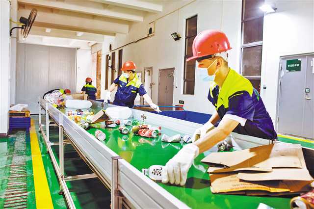 記者看到,分選中心的工人戴著口罩和手套,先是將一個個塑料袋里的各種可回收垃圾放到傳送帶上,然后傳送到分揀作業(yè)區(qū),工人分別揀出塑料飲料瓶、金屬易拉罐、廢紙板、紡織物等,放到身邊的藍色回收箱內(nèi)。