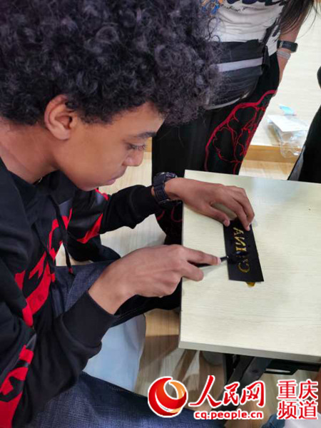 當(dāng)天,外國(guó)友人們還在重慶樹葉制作技藝非遺傳承人、“制葉堂”創(chuàng)始人李明貴的帶領(lǐng)下體驗(yàn)了巴南區(qū)非遺文化--樹葉畫制作!霸跇淙~上雕刻、作畫,所選用的的樹葉需要獨(dú)特的技藝進(jìn)行加工。只要樹葉處理的好,就跟在紙上作畫一樣!崩蠲髻F一邊給外國(guó)友人授課,一邊拿出樹葉現(xiàn)場(chǎng)教學(xué)。看著李明貴手里一張普通的樹葉變成了一副精美的畫作,外國(guó)友人們直呼好神奇!