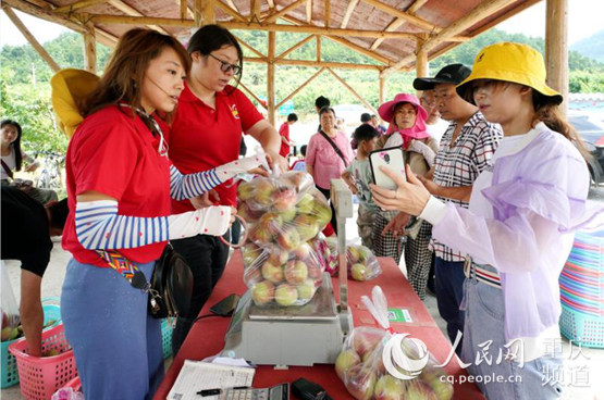 村民在指導(dǎo)游客採摘成熟的蘋果桃。何良樹攝