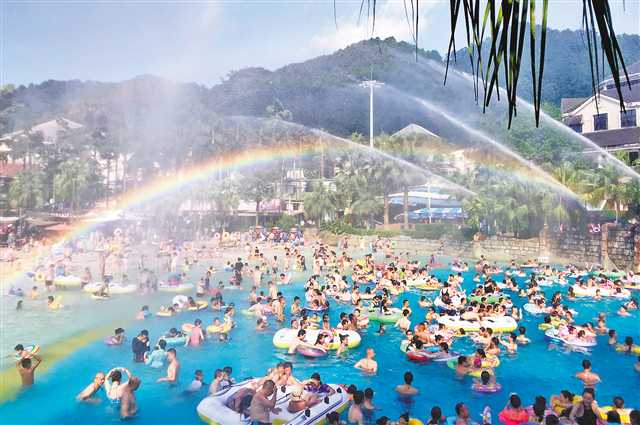 8月4日,重慶海昌加勒比海水世界景區(qū)內(nèi),市民們?cè)谟境刂懈惺芮鍥。(重慶海昌加勒比海水世界供圖)