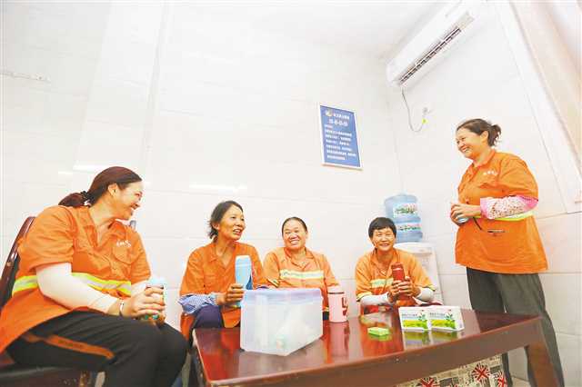 近日,萬盛經(jīng)開區(qū)盛興路附近的戶外勞動(dòng)者驛站內(nèi),環(huán)衛(wèi)工人正在納涼休息、飲水解渴。通訊員 王瀘州 攝/視覺重慶