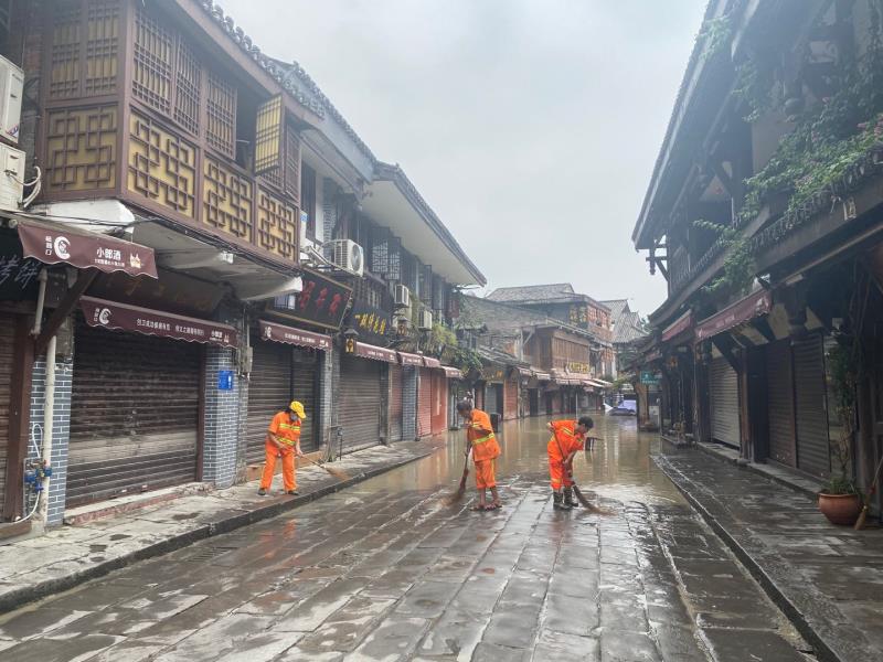 上午8時(shí),磁器口的洪水出現(xiàn)消退。沙坪壩無(wú)人員傷亡和重大財(cái)產(chǎn)損失,經(jīng)受住洪峰考驗(yàn),環(huán)衛(wèi)工人開(kāi)始打掃清淤。