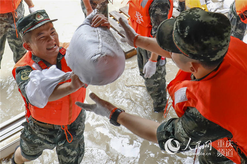 “不好,沙袋攔洪壩被洪水沖開了!”19日下午15時許,嘉陵江水位持續(xù)上漲,重慶江北區(qū)北濱路漁人灣碼頭海鮮市場的攔洪沙袋被沖開,洪水噴涌向負(fù)一層市場內(nèi),情況萬分緊急。執(zhí)勤第二支隊接到命令后,50余名官兵迅速下水,一字排開用沙袋構(gòu)筑堤壩。