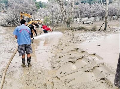 頑固的泥沙,在水槍噴射出的高壓水柱下,被沖離了屋面和地面,跟在水槍后的工作人員,立馬舉著掃帚,清掃已露出真容的地面。