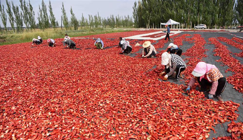 9月1日,在博湖縣塔溫覺肯鄉(xiāng)東大罕村,農(nóng)民在晾曬辣椒。
