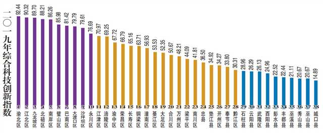 《報告》顯示,各區(qū)縣科技創(chuàng)新發(fā)展水平可分為三類:第一類是科技創(chuàng)新指數(shù)高于全市71.73%的區(qū)縣,分別是渝北區(qū)、江北區(qū)、九龍坡區(qū)、北碚區(qū)、南岸區(qū)、璧山區(qū)、巴南區(qū)、大渡口區(qū)、沙坪壩區(qū)、永川區(qū)。第二類是科技創(chuàng)新指數(shù)位于30%-71.73%的區(qū)縣,共有江津區(qū)、涪陵區(qū)、渝中區(qū)等18個區(qū)縣。第三類是科技創(chuàng)新指數(shù)低于30%的區(qū)縣,共有石柱縣、云陽縣等10個區(qū)縣。其中,27個區(qū)縣科技創(chuàng)新指數(shù)有不同幅度的提升,13個區(qū)縣位次有不同幅度的提升。