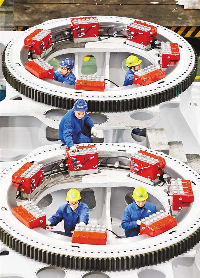 1月8日,位于兩江新區(qū)禮嘉的中國船舶集團海裝風電股份有限公司廠房內,技術人員正在抓緊裝配風電機組。記者 羅斌 攝/視覺重慶