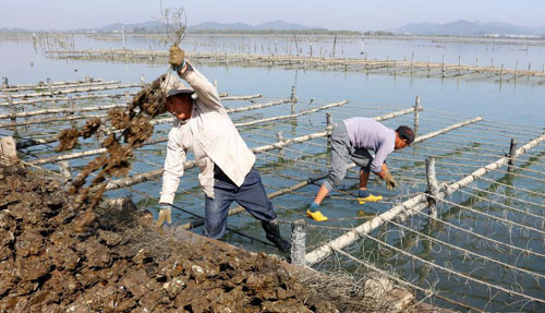 1月13日,廣東陽西縣程村鎮(zhèn)紅光村村民在收蠔。