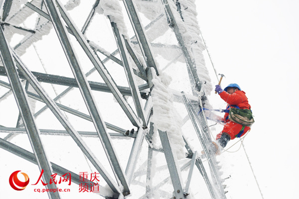 國網(wǎng)重慶巫溪供電公司員工在110千伏河白西線17號(hào)鐵塔上除冰。 李實(shí)鮮攝