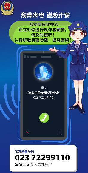 22日,重慶市涪陵區(qū)公安局反詐騙中心開通反詐預(yù)警專用號碼“023-72299110”。警方提示市民,當(dāng)接到 “023-72299110”這個(gè)號碼打來的電話,那意味著您正在遭遇電信網(wǎng)絡(luò)詐騙或者您屬于易受騙高危人群,請務(wù)必及時(shí)接聽,耐心聽取勸阻員的勸阻,避免上當(dāng)受騙。