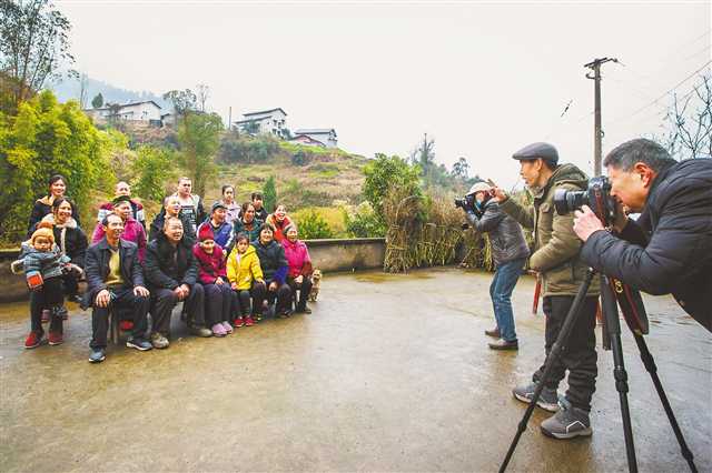 1月28日,綦江區(qū)東溪鎮(zhèn)白云村,攝影志愿者正在給四世同堂的帥承祥一家拍攝全家福。