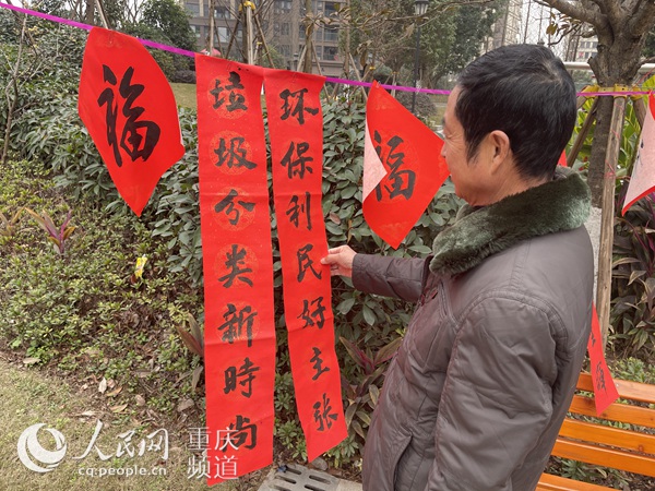 在雙碑街道首創(chuàng)城二期小區(qū),顏色分明的垃圾桶設(shè)置在小區(qū)出入口旁,時刻提醒業(yè)主記得垃圾分類。兩位愛好書法的小區(qū)業(yè)主,將寫好的環(huán)保春聯(lián)一幅幅掛在小區(qū)中庭,過往的小區(qū)居民免費領(lǐng)取,準(zhǔn)備回家貼在門前。