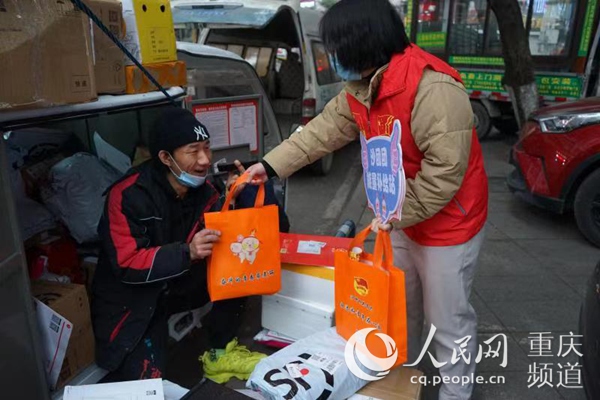 青年志愿者為快遞從業(yè)人員送去慰問禮包。 共青團(tuán)沙坪壩區(qū)委供圖