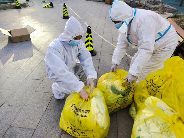 在北京市西城區(qū)手帕口南街核酸檢測(cè)點(diǎn),申學(xué)進(jìn)(左)和同事一起對(duì)核酸檢測(cè)產(chǎn)生的醫(yī)療垃圾進(jìn)行集中收運(yùn)、消毒。 臧紅林?jǐn)z