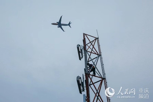 母科峰在導(dǎo)航臺天線鐵塔上巡查,一架飛機從他頭頂飛過。鄒樂攝