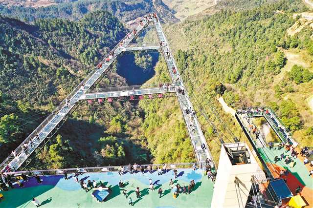 2月14日,萬盛經(jīng)開區(qū)黑山之巔的夢幻奧陶紀(jì)主題公園,游客行走在云端廊橋上。特約攝影 曹永龍/視覺重慶