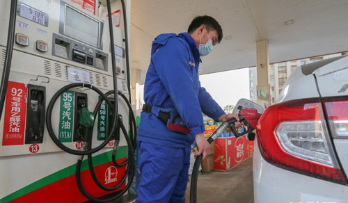 2月18日,江蘇省連云港市一加油站的工作人員在給汽車加油。