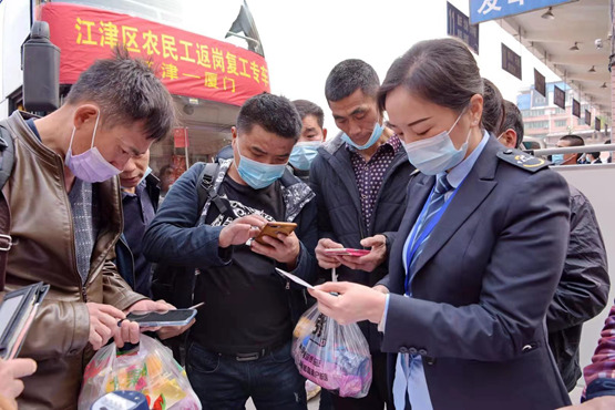 為保障這些外出務工人員安全有序出行,江津區(qū)組織相關單位,積極結合疫情防控網(wǎng)格化管理和返鄉(xiāng)人員日監(jiān)測工作機制,建立了返鄉(xiāng)務工人員實名制信息和返崗復工人員出行需求臺賬,在此基礎上協(xié)同公安、交通、運輸?shù)炔块T,對集中出行人員實施“分組編隊、準備物資、請前提醒、出發(fā)簽到、途中銜接、抵達對接”,科學合理地制定出行方案,共同助力務工人員“點對點”返崗。