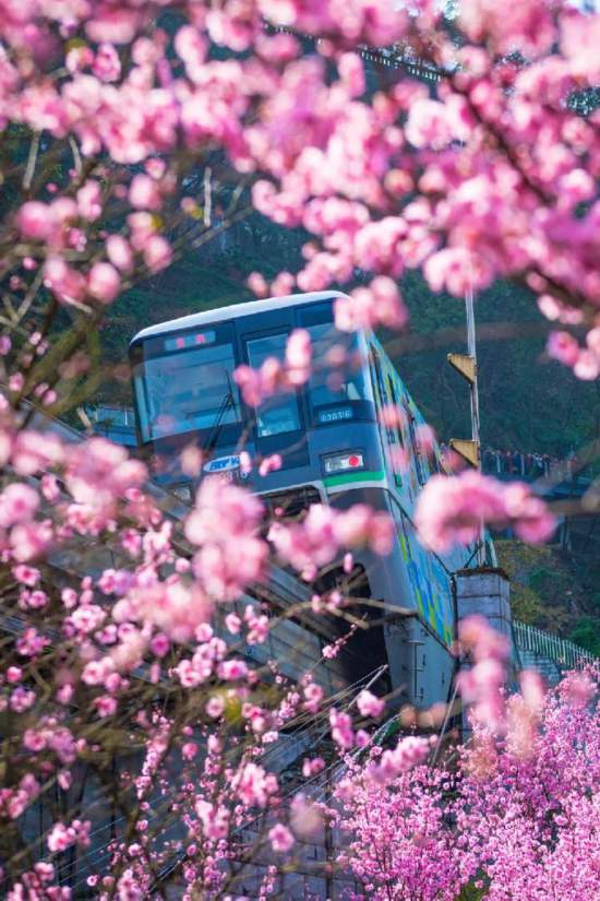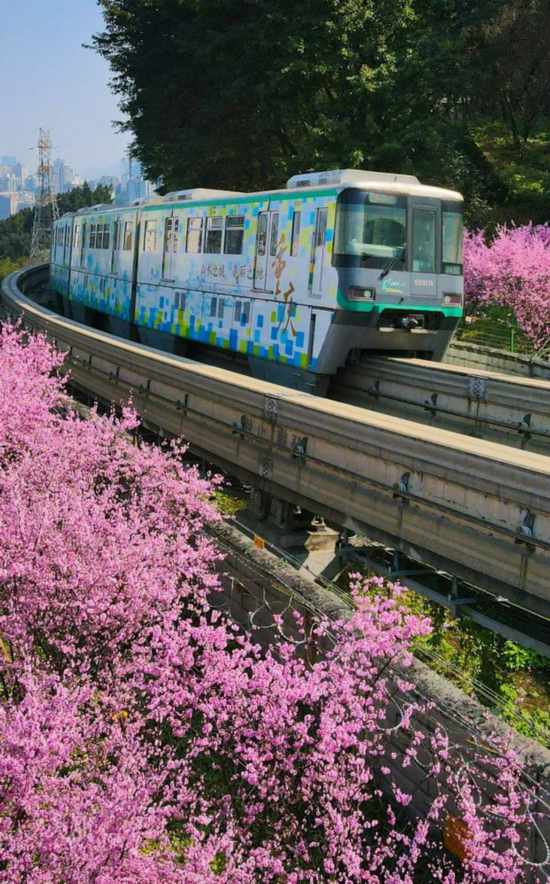 近日,重慶軌道交通2號(hào)線佛圖關(guān)段,大面積的美人梅花盛開,單軌列車穿行在花海中,如開往春天的列車,成為一道城市亮麗的風(fēng)景線。鄒樂 攝