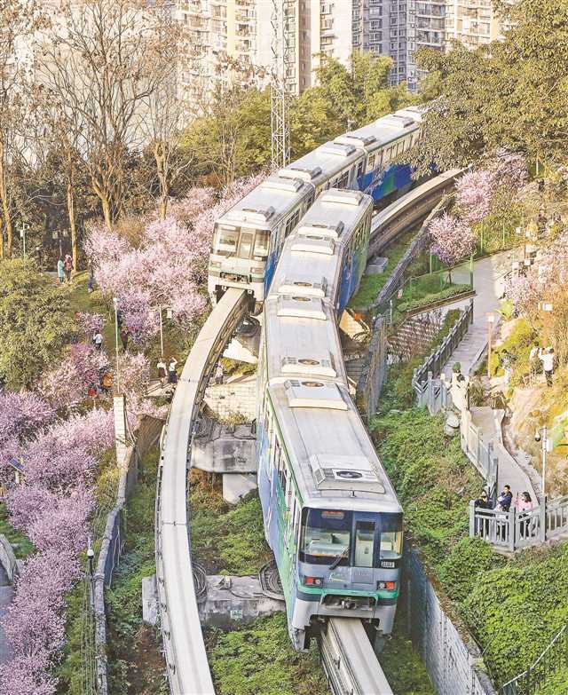 二月十九日下午,軌道交通二號(hào)線渝中區(qū)佛圖關(guān)段,單軌列車穿梭在花海中。記者 蘇思 攝\視覺重慶