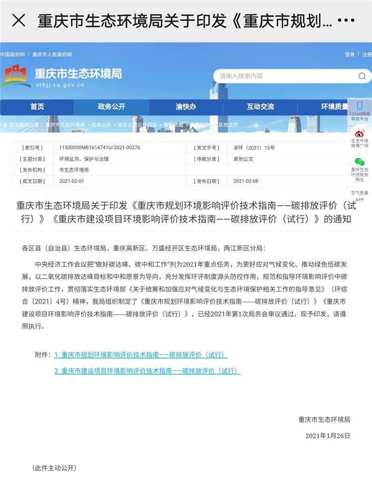 2月24日,上游新聞·重慶晨報(bào)記者從重慶市生態(tài)環(huán)境局獲悉,2021年1月,重慶市生態(tài)環(huán)境局發(fā)布了《重慶市規(guī)劃環(huán)境影響評價(jià)技術(shù)指南——碳排放評價(jià)(試行)》《重慶市建設(shè)項(xiàng)目環(huán)境影響評價(jià)技術(shù)指南——碳排放評價(jià)(試行)》,已于2021年1月26日起實(shí)施。