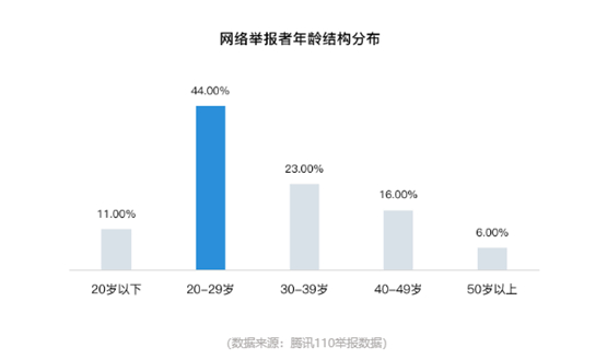 網(wǎng)絡(luò)詐騙舉報者整體呈年輕化。舉報者年齡介于20-29歲之間的比重達44%,占舉報用戶近五成。