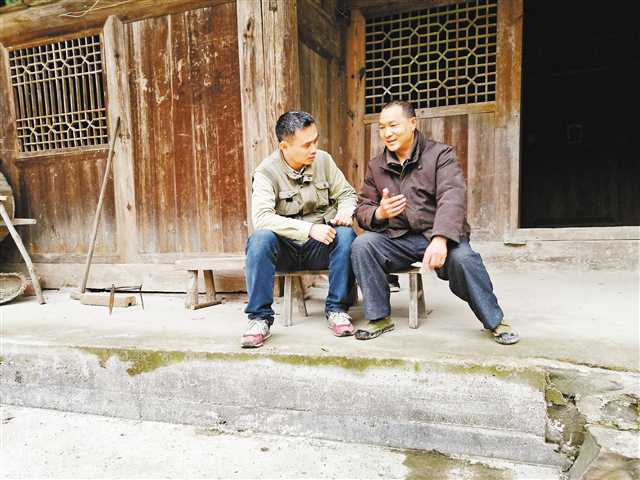 三月三日,劉昶(左)到村民任淆章家中走訪。(受訪者供圖)