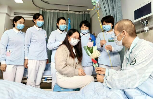 “親愛的,你辛苦了,節(jié)日快樂!”3月8日下午,正在陸軍軍醫(yī)大學(xué)新橋醫(yī)院血液病醫(yī)學(xué)中心接受造血干細(xì)胞移植的軍人顏棟(化名)給妻子張穎(化名)送上一朵手工制作的郁金香。
