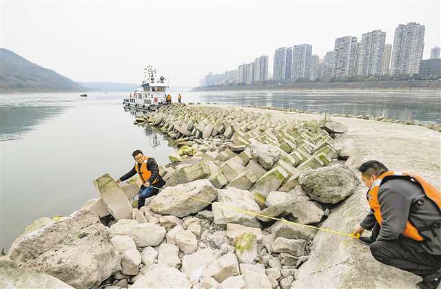 3月9日,長(zhǎng)江航道江津段,航道工人利用枯水期排查去年特大洪峰對(duì)航道設(shè)施的損壞情況。