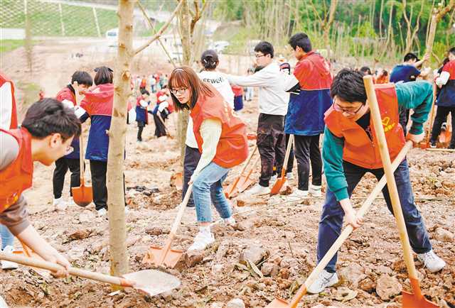 3月12日,江北區(qū)五寶鎮(zhèn),參加春季義務植樹的青年志愿者們正在給新種下的樹木培土。記者 崔力 攝/視覺重慶