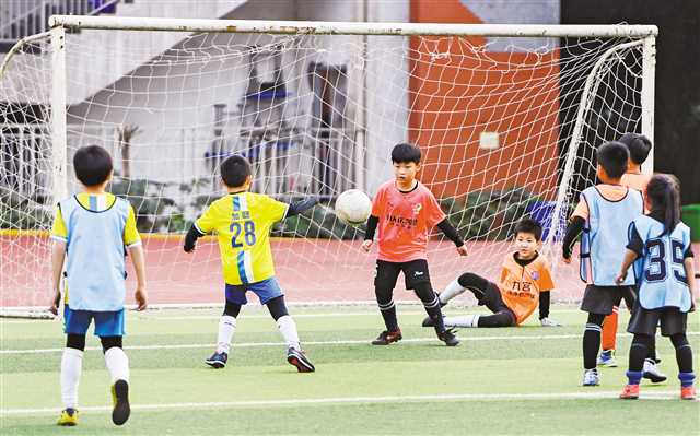 3月3日課后延時(shí)服務(wù)時(shí)間,兩江新區(qū)天宮殿學(xué)校學(xué)生在踢足球。