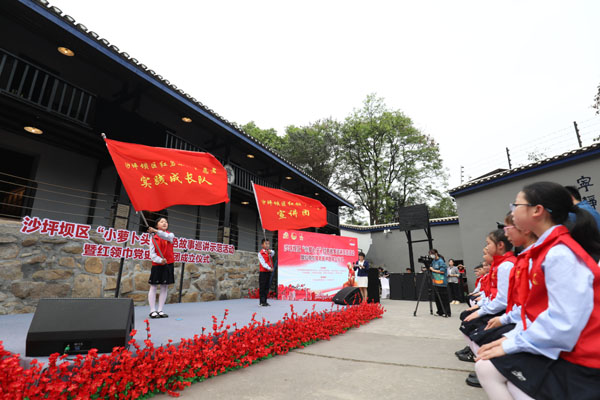 紅領巾黨史宣講團、紅巖小小志愿者實踐成長隊授旗成立。沙坪壩區(qū)委宣傳部供圖