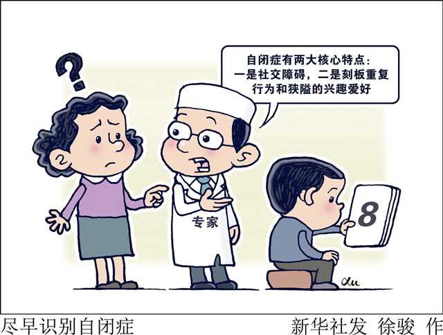 任意年齡自閉癥可能出現(xiàn)的癥狀:回避眼神接觸,喜歡獨(dú)處;對理解別人的情感存在困難;語言發(fā)育遲緩;重復(fù)相同的詞語或短語;例行規(guī)律或環(huán)境的輕微改變而煩躁;興趣極度狹窄;喜歡重復(fù)做手拍動、身體擺動或旋轉(zhuǎn)的動作;對聲音、氣味、味道、物體質(zhì)地、光線或顏色有異常和強(qiáng)烈的反應(yīng)。