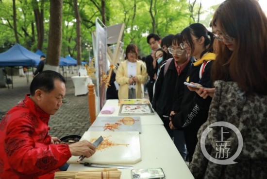 為了保護和傳承非遺文化,讓大學生親近這些傳統(tǒng)技藝,4月8日,西南大學在南區(qū)樟樹林開展“潤物無聲·非遺進校園”活動。重慶市一級非遺傳承人來到活動現(xiàn)場,為西南大學師生帶來了糖畫、捏面人、葫蘆烙畫、蜀繡等經(jīng)典手藝的展演制作,通過一系列互動讓傳統(tǒng)文化“活”起來。