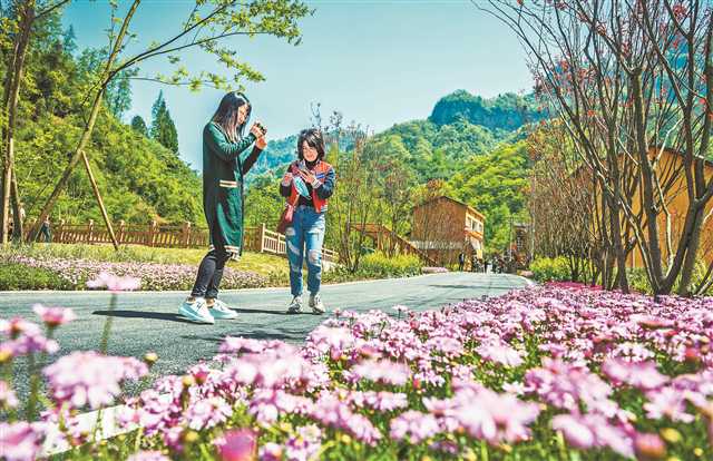 2020年4月15日,石柱縣中益鄉(xiāng)華溪村偏巖壩,游客正在拍攝院落里的花朵。記者 龍帆 攝/視覺重慶