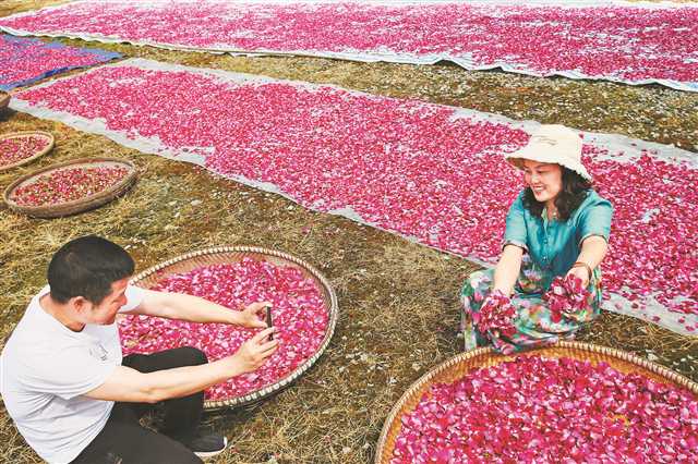 2020年五一長假期間,黔江區(qū)沙壩鎮(zhèn)天香玫瑰莊園的300畝玫瑰盛開,引來不少游客前來游玩、賞花和體驗采花、晾曬花瓣。特約攝影 楊敏/視覺重慶