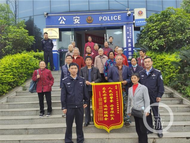 4月14日上午,22名老人一路敲鑼打鼓將一面印有“人民好警察 辦事很認(rèn)真 為民辦實(shí)事 追回被騙金”的錦旗和一封感謝信送到永川區(qū)來蘇派出所,為民警盡心盡責(zé)幫老人們挽回?fù)p失表示感謝。