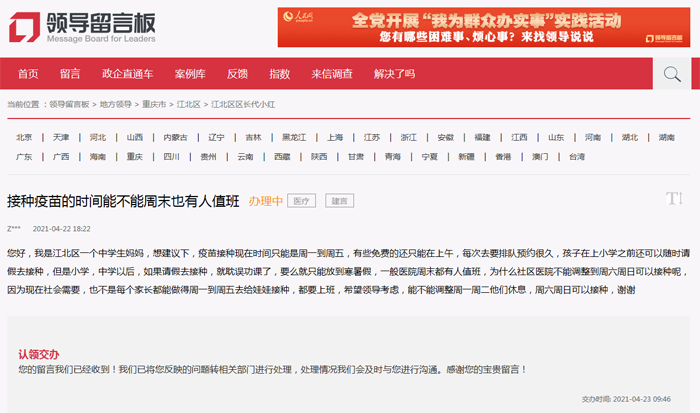 人民網(wǎng)重慶4月23日電 (陳琦)最近,網(wǎng)友通過人民網(wǎng)《領(lǐng)導(dǎo)留言板》留言,建議社區(qū)醫(yī)院周六周日也可以接種,方便上班族在休息日能帶孩子去。