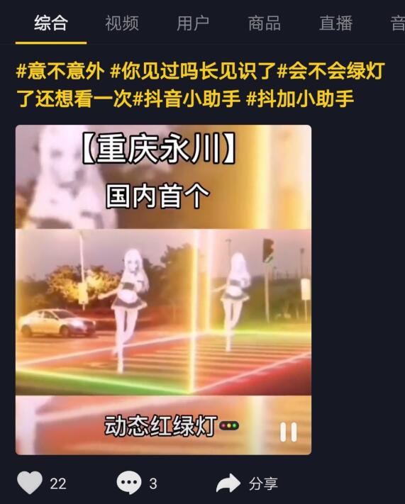 視頻的字幕中顯示:“重慶永川,網(wǎng)紅紅綠燈,為這個(gè)創(chuàng)意點(diǎn)贊。”等字眼。