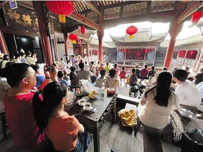 此次銅梁原鄉(xiāng)文旅周也在文旅融合新玩法上進(jìn)行了探索。比如在安居古城“唱”玩夜上演之前,古城主要景點(diǎn)也推出了一系列傳統(tǒng)文化活動(dòng)。記者在現(xiàn)場看到,《翰林省親》《蚌姑戲沙彌》等傳統(tǒng)民俗表演節(jié)目的演員們身著戲服,以千年古城地標(biāo)景點(diǎn)為舞臺(tái),在游客中間進(jìn)行表演,不但拉近了觀眾與演員的距離,也讓觀眾更好融入了傳統(tǒng)藝術(shù)氛圍里。大家看得津津有味,贊不絕口。眾多民俗節(jié)目展演展現(xiàn)了安居古城多元文化的魅力,傳統(tǒng)與現(xiàn)代在歲月靜好的千年古城碰撞出不一樣的火花。