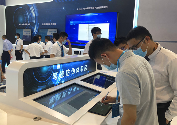 交博會上,市民在筆記防偽體驗區(qū)體驗。萬文艷攝