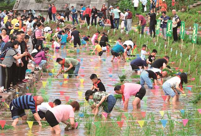當(dāng)天,“醉美鄉(xiāng)愁·義渡田園”——大渡口區(qū)第二屆農(nóng)耕文化體驗(yàn)活動(dòng)在石盤村舉行,親子栽秧、稻田抓魚、打糍粑等豐富多彩的活動(dòng)讓市民們樂在其中。大渡口區(qū)融媒體中心 龍?jiān)谌?攝
