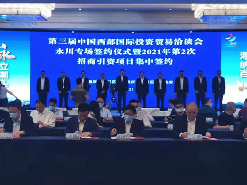 人民網(wǎng)重慶5月21日電 21日下午,第三屆中國(guó)西部國(guó)際投資貿(mào)易洽談會(huì)(簡(jiǎn)稱“西洽會(huì)”)永川專場(chǎng)簽約儀式暨2021年第2次招商引資項(xiàng)目集中簽約儀式舉行,永川簽約69個(gè)項(xiàng)目,其中6個(gè)項(xiàng)目參與第三屆西洽會(huì)全市重大項(xiàng)目集中簽約。