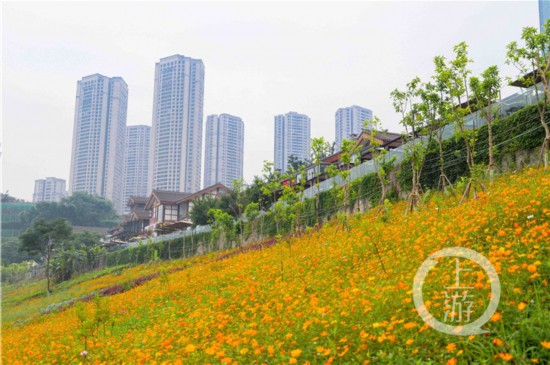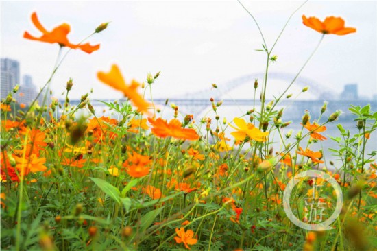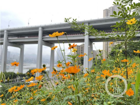 最近,在朝天門大橋北橋頭附近出現(xiàn)了多片花海,引人駐足。